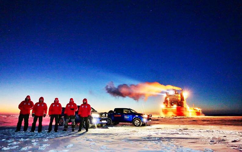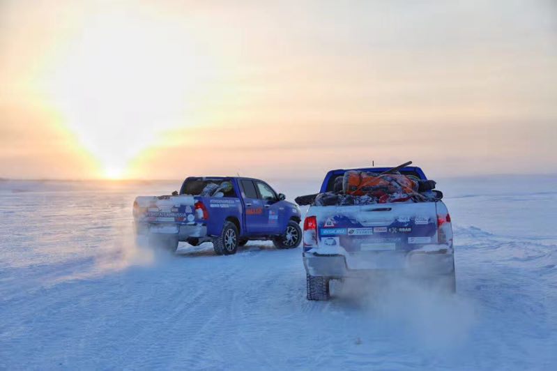 對于探險的參與人員而言,最困難的地方在于花了整整一天克服的最后30公里路程!無畏的旅行家們駕駛著Hilux為自己鑿開一條路穿過沒人走過的雪地和冰山,有時以掉落的側裙和裂開的前保險桿為代價。“這趟旅行成為了對于我們整個隊伍的強度的一次考驗。暴風雪、沿著滑冰的路線和甚至是很有可能碰到北極熊,我們有察覺到腳印和巢穴。 - 所有的這一切都不能停止我們通往目標的道路, - 探險隊的領導Bogdan Bulychev在終點的時候說道。 - 我們的團隊查明了這兩臺Toyota Hilux的信譽。我們所有人一起能夠克服1000公里的極地夜晚的艱難條件和極端低溫。”關于輪胎的部分,Bulychev指出,在大部分的路線中這些輪胎在極度低的大氣壓力0.3-0.5中工作。”